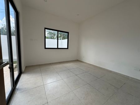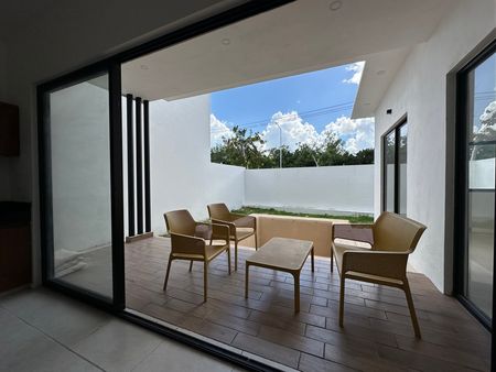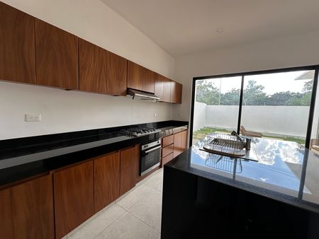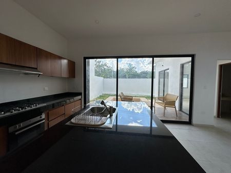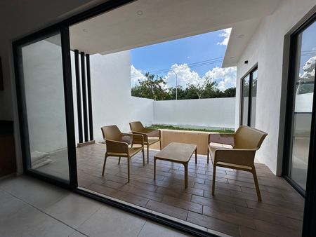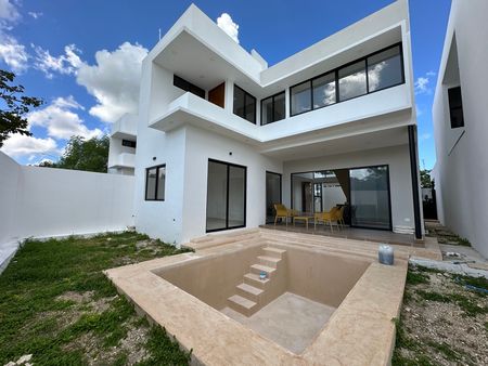 Garage para 3 autos (2 techados), jardín zen con terraza, baño completo, sala, comedor, cocina equipada con gabinetes de madera de Tzalam y cubierta de granito, área de lavado o bodega, estudio o recámara de visitas, terraza, alberca de 4 × 5 m, patio con jardín y pasillo lateral.
